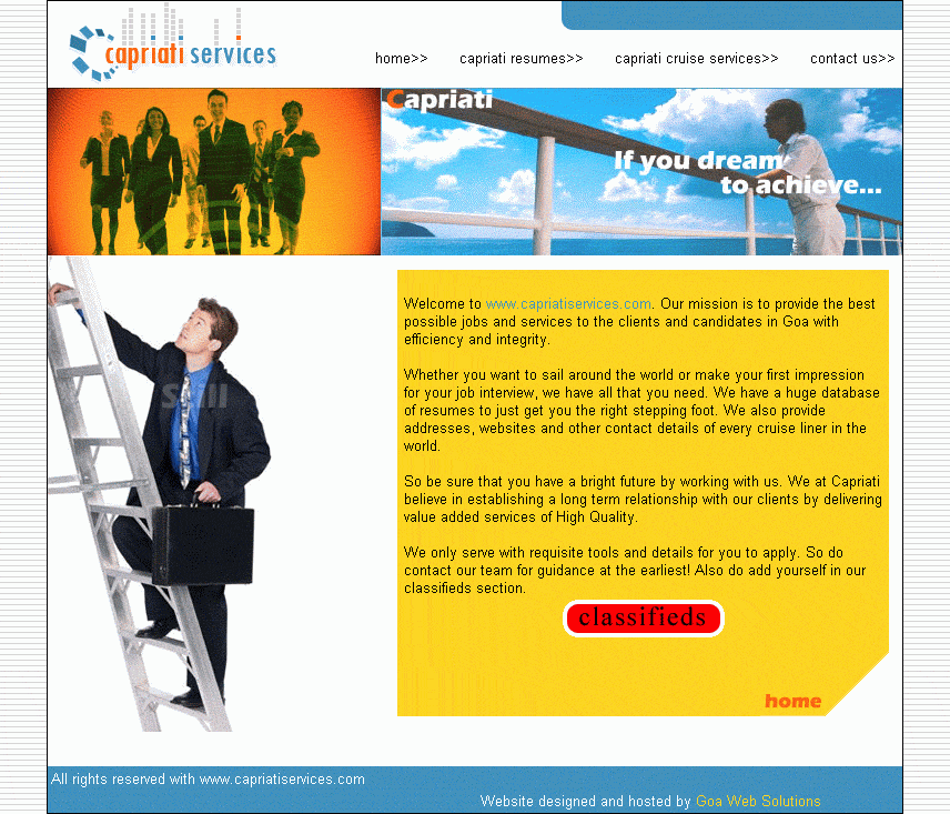The task included Website Design and Development for Goa based resume services company Capriati Services. HTML and CSS is used for the site layout. PHP is used as server side scripting language integrated with MySQL database for classifieds section.