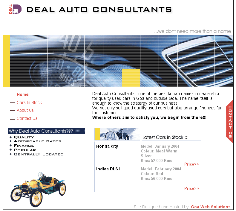 The work included Website Design and Website Development for Goa based quality used car dealers Deal Auto Consultants. The control panel for updating the car catalogue was made using PHP and MySQL database. HTML and CSS was used for the layout.