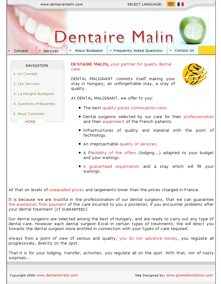 The task included Website Design for a FRANCE based company DENTAIRE MALIN providing dental health holidays. The site is bilingual in content. HTML and CSS is used for the website layout. While PHP is used as the server side scripting language for forms.