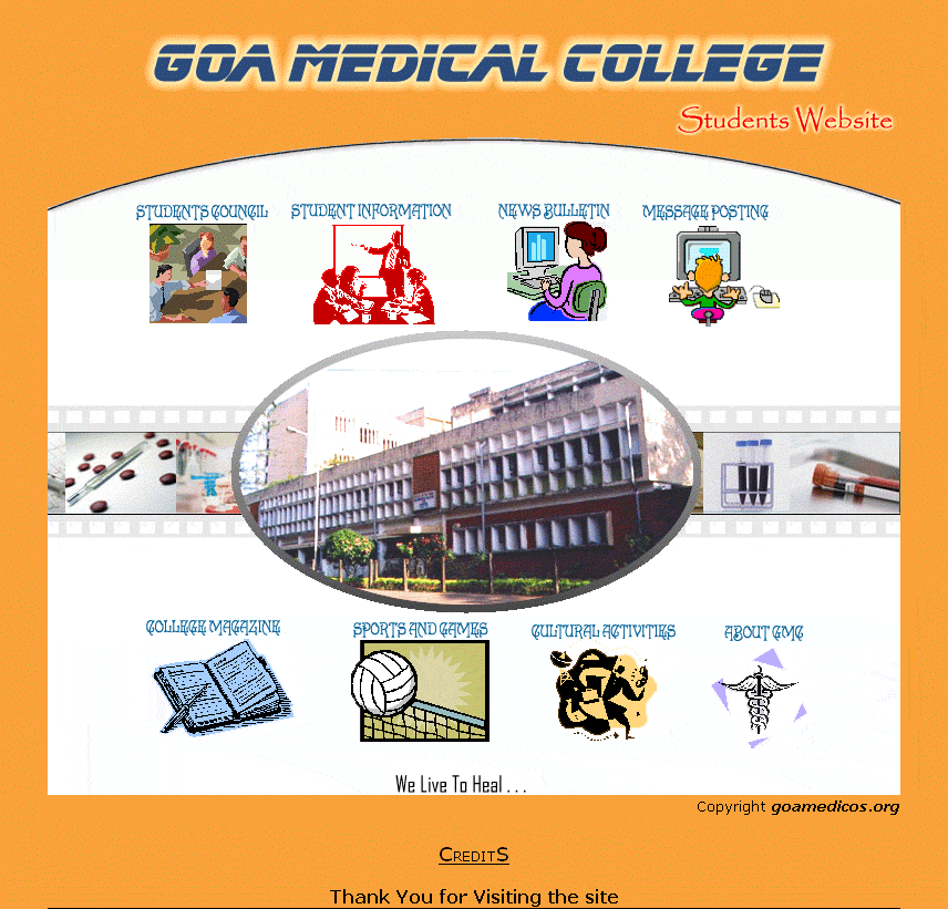 The task included Website Design in flash for the Students' Website of Goa Medical College. A Flash intro and HTML is used for the website's homepage layout.